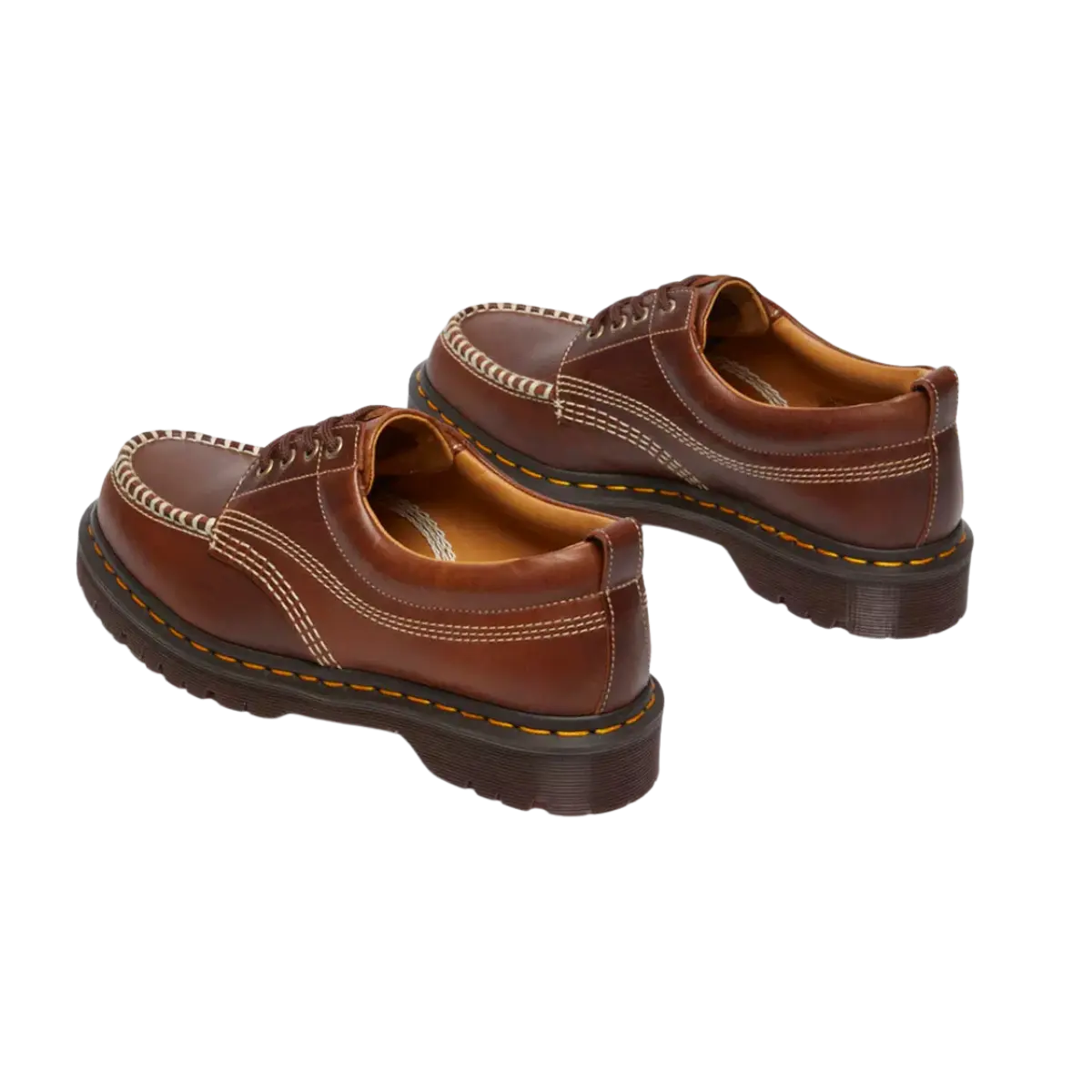 El zapato Lowell de 4 ojales combina la estética contemporánea con un diseño de ropa de trabajo de archivo. Está confeccionado en piel Orleans marrón con un cómodo cuello acolchado, costuras y una puntera de estilo mocasín. La acanalada suela BEN está marcada con el emblemático pespunte amarillo.